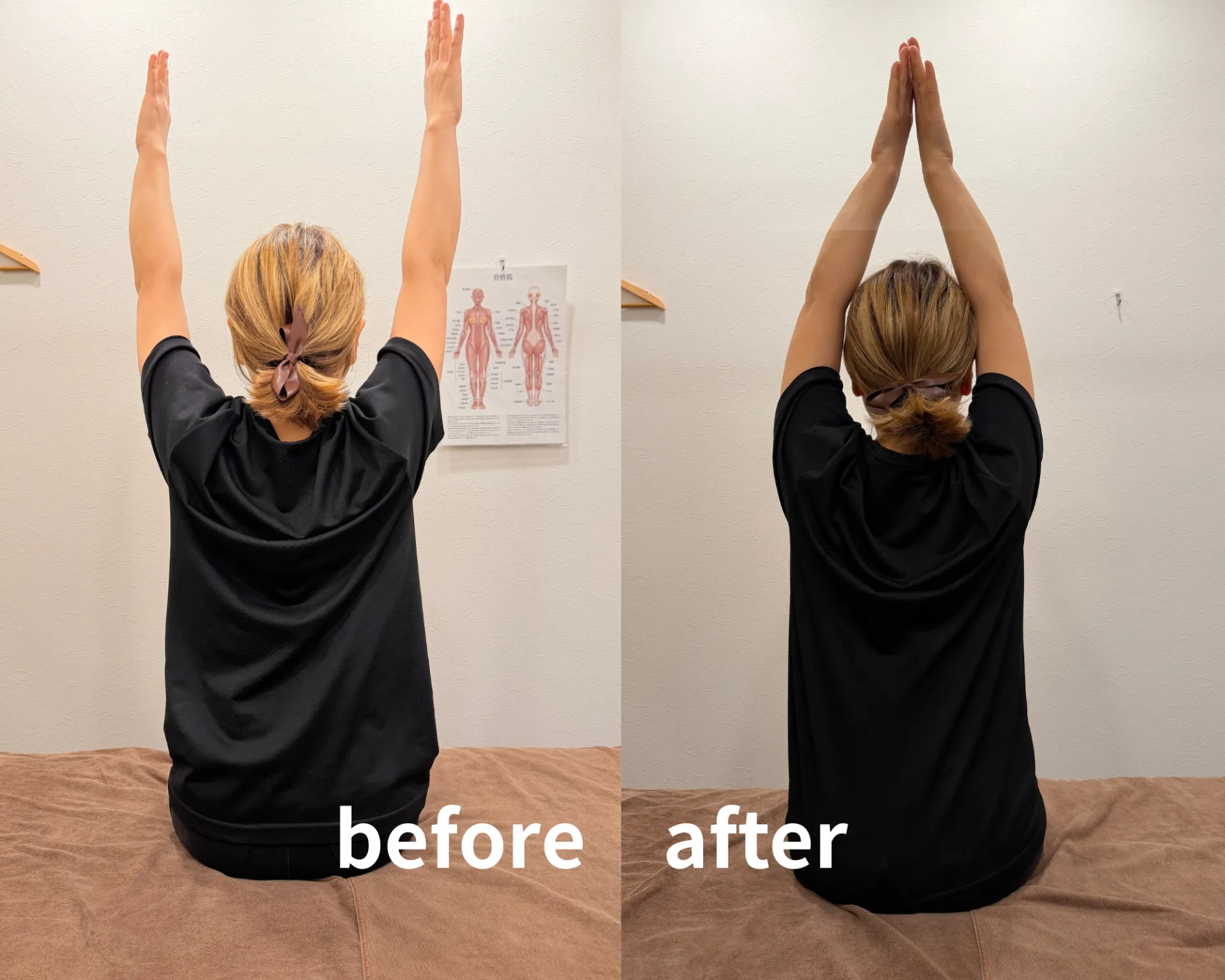 施術は骨盤・腰椎のゆがみリセットから開始。胸の前(小胸筋)を緩めるアドバイスも加え、「巻き肩」が解消され姿勢が改善、肩甲骨の可動もアップ。頭部かっさアプローチでは首こりや頭痛も軽減し、「肩が動かしやすく、首も楽になった」と実感されました。
